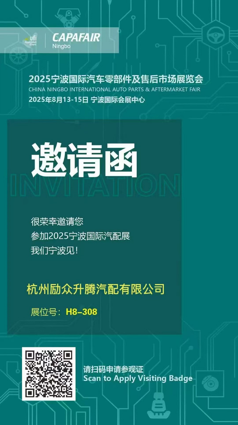 にアクセスしてください H8-308 WD ブランドと当社のワンストップ OEM およびアフターマーケット ソリューションについて詳しく知るには、こちらをご覧ください。招待状にある QR コードをスキャンして、今すぐビジター パスに登録してください。